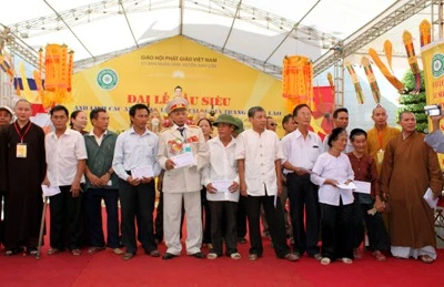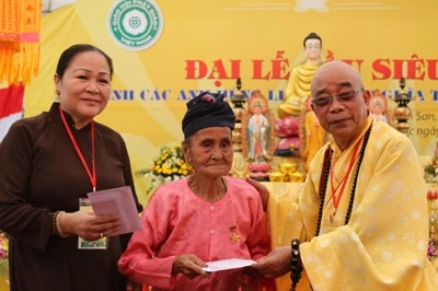 Bà Nguyễn Thị Thanh Thủy - Phó trưởng BTC Đại lễ tri ân và bà Trương Thị Nở - Ban Từ thiện xã hội, Giáo hội Phật giáo Việt Nam đã trao hơn 100 suất quà và tiền, mỗi suất 1 triệu đồng cho 52 Bà mẹ Việt Nam Anh hùng và 68 thương bệnh binh, người có công. Ngoài ra, BTC cũng đã trao hỗ trợ thêm 25 triệu đồng cho Nhà Văn hóa Thanh niên huyện Anh Sơn; 15 triệu đồng cho Trung đoàn 335 - QK4 và hơn 100 suất quà, mỗi suất 50 ngàn đồng cho hơn 100 học sinh nghèo vượt khó học giỏi trên địa bàn huyện Anh Sơn.