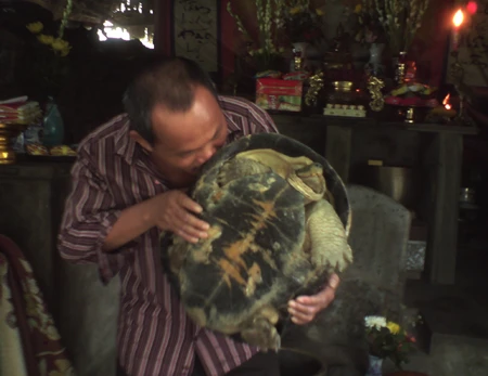 Ông Nguyễn Nghĩa Bình - người tình nguyện lên đây canh giữ Chùa Đại Tuệ từ năm 1991 - kể lại: “Gần 20 năm canh giữ chùa tôi chưa từng gặp bất kỳ một con rùa nào. Nhưng khoảng 8 giờ sáng ngày 23/9 vừa qua, tôi đang quét dọn thì bỗng phát hiện hai cụ rùa ẩn sau Chùa Đại Tuệ. Hai cụ nằm im lặng, không nhúc nhích. Tôi đã thắp hương cầu khấn, xin được bế hai cụ vào trong chùa cho nghỉ…”.