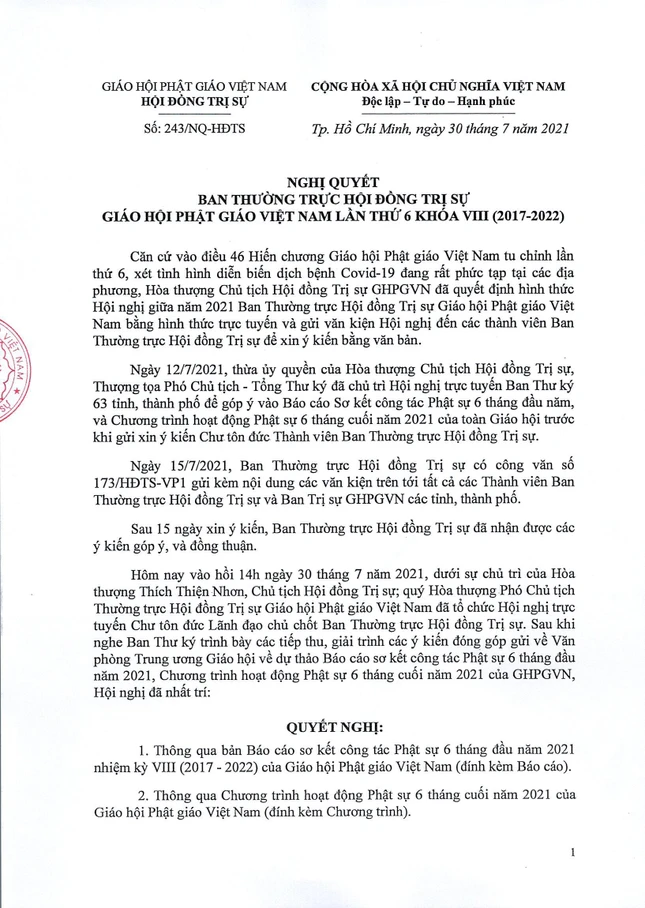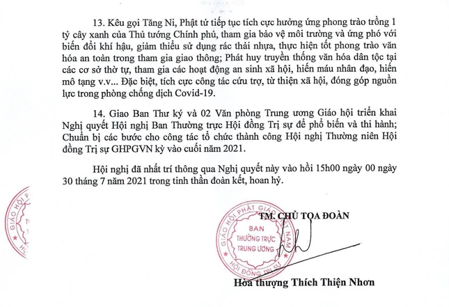 Hội nghị đã nhất trí thông qua Nghị quyết này vào hồi 15giờ ngày 30-7-2021 trong tinh thần đoàn kết, hoan hỷ.