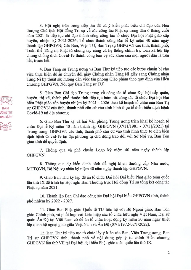 9. Giao Ban Thư ký lập đề án tổ chức Đại hội Đại biểu Phật giáo toàn quốc lần thứ IX để trình tại Hội nghị Ban Thường trực Hội đồng Trị sự tổng kết công tác Phật sự năm 2021.