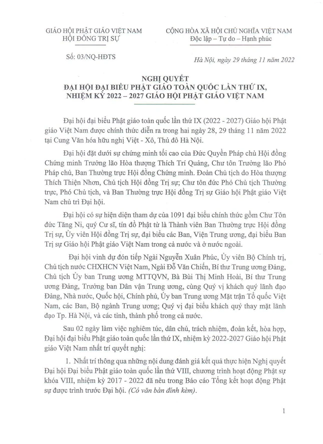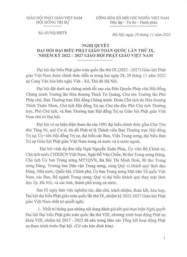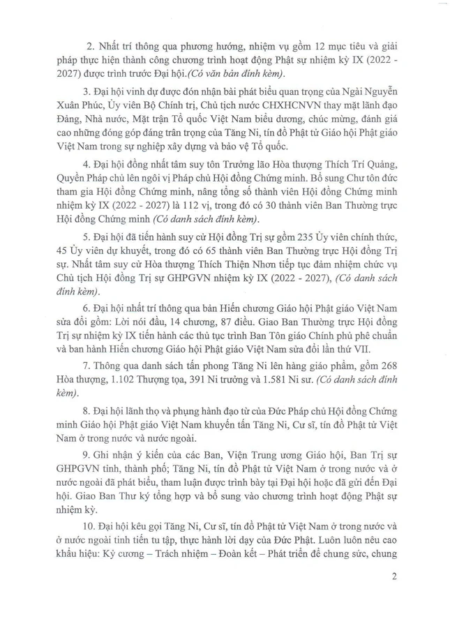 Sau 2 ngày làm việc nghiêm túc, dân chủ, trách nhiệm, đoàn kết, hòa hợp, Đại hội đại biểu Phật giáo toàn quốc lần thứ IX (2022-2027) GHPGVN nhất trí quyết nghị:
