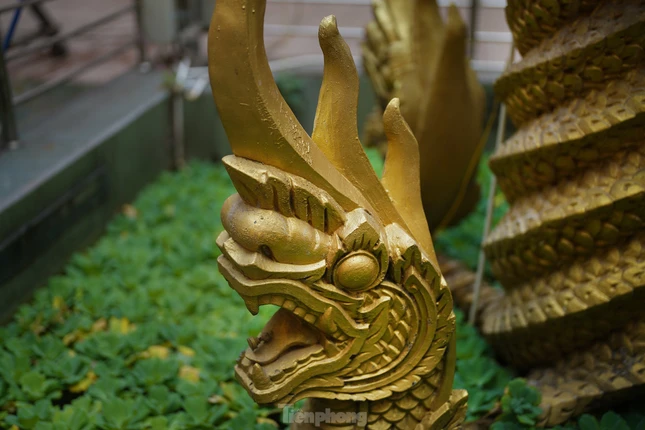 Hồ nước sân chùa trang trí hình tượng rắn Naga làm chân đế bảo tháp