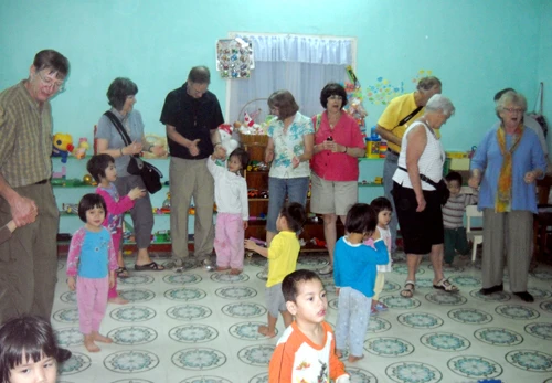 Các em nhỏ vui đùa cùng đoàn khách quốc tế đến thăm
