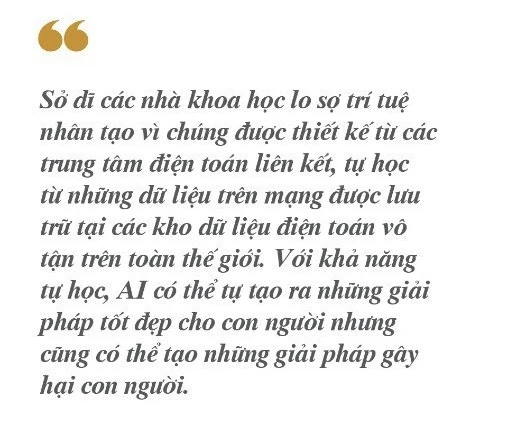 Sở dĩ các nhà khoa học lo sợ trí tuệ nhân tạo vì chúng được thiết kế từ các trung tâm điện toán liên kết, tự học từ những dữ liệu trên mạng được lưu trữ tại các kho dữ liệu điện toán vô tận trên toàn thế giới. Với khả năng tự học, AI có thể tự tạo ra những giải pháp tốt đẹp cho con người nhưng cũng có thể tạo những giải pháp gây hại con người.