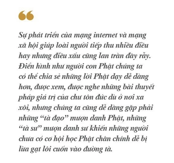 Sự phát triển của mạng internet và mạng xã hội giúp loài người tiếp thu nhiều điều hay nhưng điều xấu cũng lan tràn đầy rẫy. Điển hình như người con Phật chúng ta có thể chia sẻ những lời Phật dạy dễ dàng hơn, được xem, được nghe những bài thuyết pháp giá trị của chư tôn đức dù ở nơi xa xôi, nhưng chúng ta cũng dễ dàng gặp phải những “tà đạo” mượn danh Phật, những “tà sư” mượn danh sư khiến những người chưa có cơ hội học Phật chân chính dễ bị lừa gạt lôi cuốn vào đường tà.