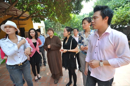 Các người đẹp được sư thầy Thích Đàm Lan dẫn đi thăm quan chùa và sang thăm khu trẻ nhỏ