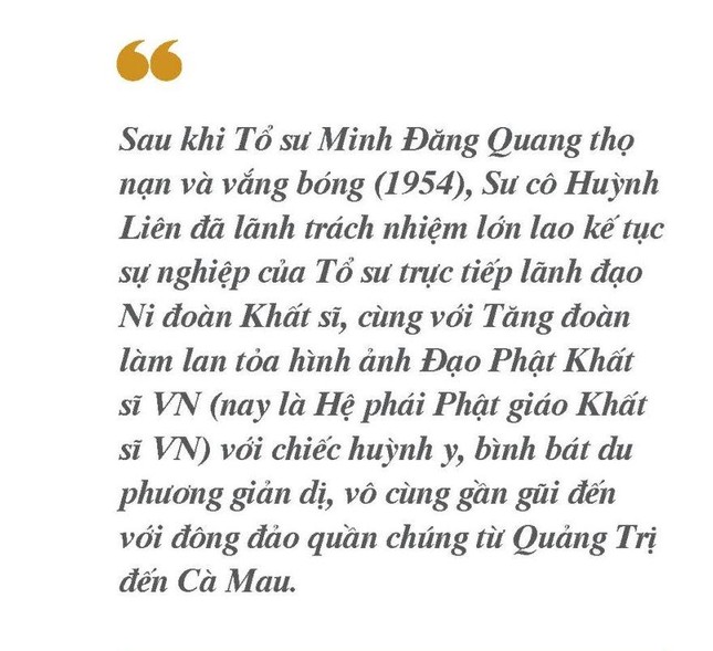 “Cố Ni trưởng Huỳnh Liên là người khá đặc biệt, Đệ nhất Trưởng Ni giới Hệ phái Khất sĩ. Sinh tiền, Ni trưởng đã chu toàn trọng trách được Tổ Sư Minh Đăng Quang giao phó lãnh đạo Ni đoàn, kiến lập tịnh xá. Tính từ năm 1954 đến 1975, cố Ni trưởng đã khai mở khoảng 200 tịnh xá. Đặc biệt, Ni trưởng có tư tưởng tiến bộ, khuyến tấn Ni giới tu - học song hành. Cố Ni trưởng cũng chủ trương Việt hóa, biên soạn, dịch thuật kinh điển chữ Hán, Pali thành những bài diễn dịch, kệ tụng Việt ngữ để chư Ni các tịnh xá đọc tụng cho đến ngày nay.