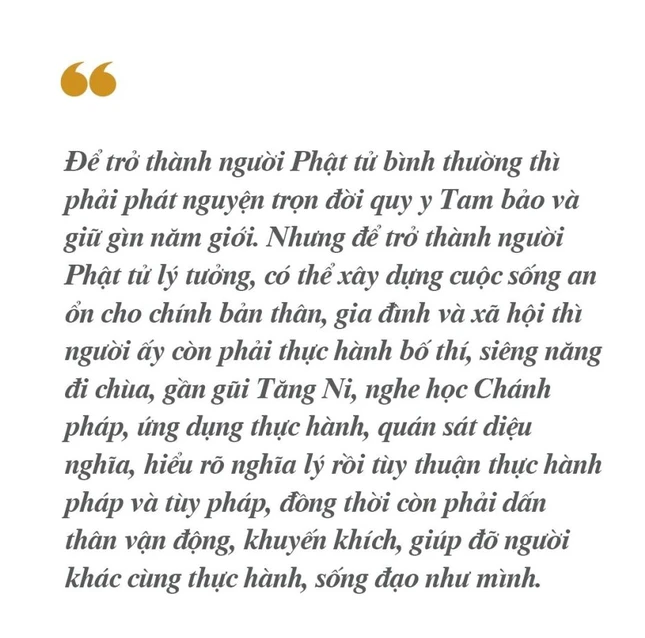 Như vậy, để trở thành người Phật tử bình thường thì phải phát nguyện trọn đời quy y Tam bảo và giữ gìn năm giới. Nhưng để trở thành người Phật tử lý tưởng, có thể xây dựng cuộc sống an ổn cho chính bản thân, gia đình và xã hội thì người ấy còn phải thực hành bố thí, siêng năng đi chùa, gần gũi Tăng Ni, nghe học Chánh pháp, ứng dụng thực hành, quán sát diệu nghĩa, hiểu rõ nghĩa lý rồi tùy thuận thực hành pháp và tùy pháp, đồng thời còn phải dấn thân vận động, khuyến khích, giúp đỡ người khác cùng thực hành, sống đạo như mình.