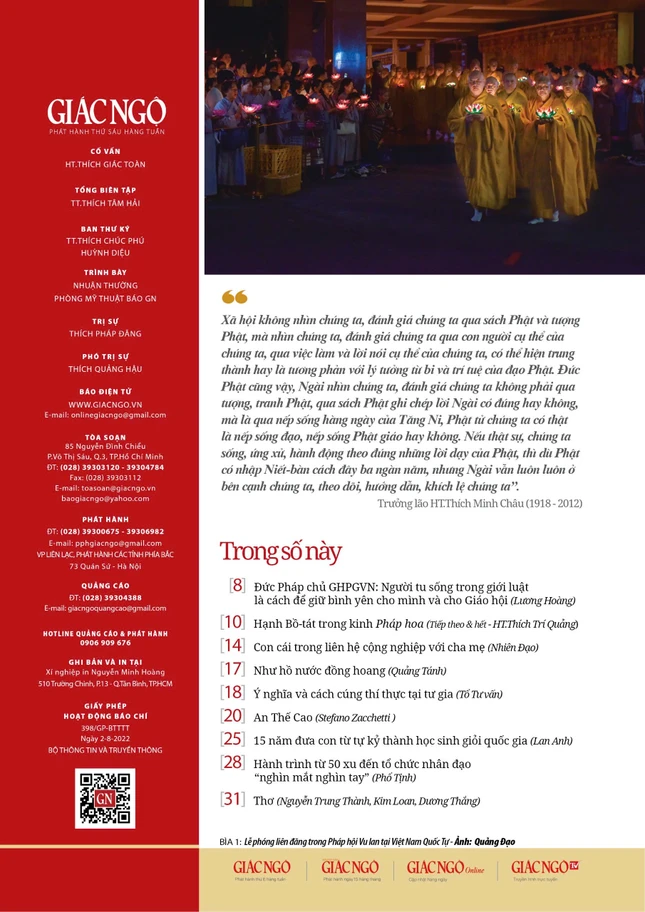 - Các chuyên mục khác: "Hành trình từ 50 xu đến tổ chức nhân đạo 'nghìn mắt nghìn tay'" (Phổ Tịnh tổng hợp); Thơ của Nguyễn Trung Thành, Kim Loan, Dương Thắng... cùng những tin tức Phật giáo nổi bật.