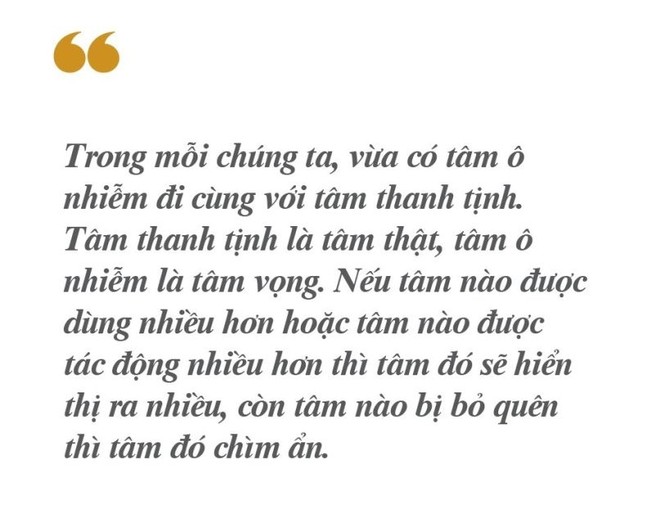 Trong mỗi chúng ta, vừa có tâm ô nhiễm đi cùng với tâm thanh tịnh. Tâm thanh tịnh là tâm thật, tâm ô nhiễm là tâm vọng. Nếu tâm nào được dùng nhiều hơn hoặc tâm nào được tác động nhiều hơn thì tâm đó sẽ hiển thị ra nhiều, còn tâm nào bị bỏ quên thì tâm đó chìm ẩn. Điều này được thể hiện rõ ràng trong cuộc sống. Nếu ta gặp người vui vẻ hiền lành thì lòng mình cũng thấy an yên. Ngược lại, gặp người luôn than thở sầu khổ thì lòng mình cũng buồn bã bất an.