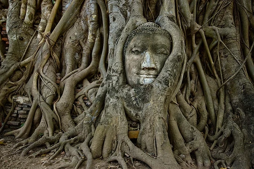 Thành phố Ayutthaya ở Thái Lan là nơi tọa lạc một trong những bức tượng Phật bất thường nhất trên thế giới . Trong số những tàn tích của Chùa Mahathat (Chùa của Khu di tích lớn) vẫn còn phần đầu của bức tượng bằng đá sa thạch mà các phần tượng khác đã bị thất lạc. Phần đầu tượng này nằm kẹt trong rễ leo và dây leo của cây cổ thụ. Xung quanh bức tượng nổi tiếng này là nhiều tượng khác của thời kỳ Ayutthaya đã còn lại sau sự tàn phá của thời gian.