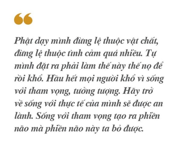 Phật dạy mình đừng lệ thuộc vật chất, đừng lệ thuộc tình cảm quá nhiều. Tự mình đặt ra phải làm thế này thế nọ để rồi khổ. Hầu hết mọi người khổ vì sống với tham vọng, tưởng tượng. Hãy trở về sống với thực tế của mình sẽ được an lành. Sống với tham vọng tạo ra phiền não mà phiền não này ta bỏ được.