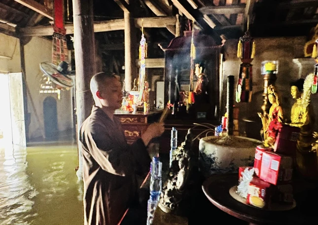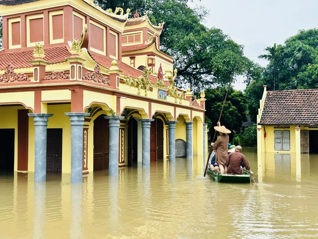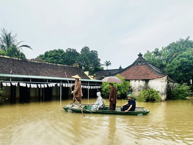 Thượng tọa Thích Minh Quang chèo xuồng đưa đoàn cứu trợ vào chùa Thôn Năm |