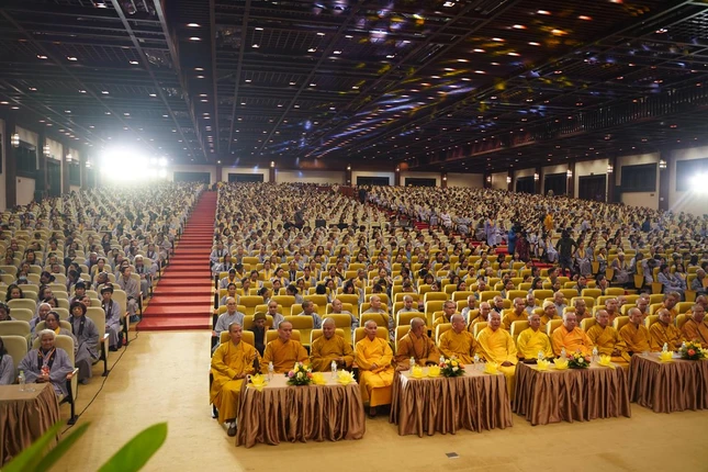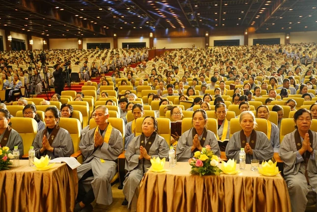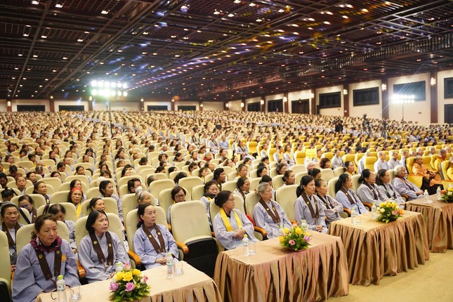 Buổi trưa, dưới sự hướng dẫn của Hòa thượng Trưởng ban Tổ chức cùng chư tôn đức Tăng, toàn thể đại chúng đã thực hiện nghi thức cúng Quá đường, dùng cơm chay trong chánh niệm, tỉnh thức.