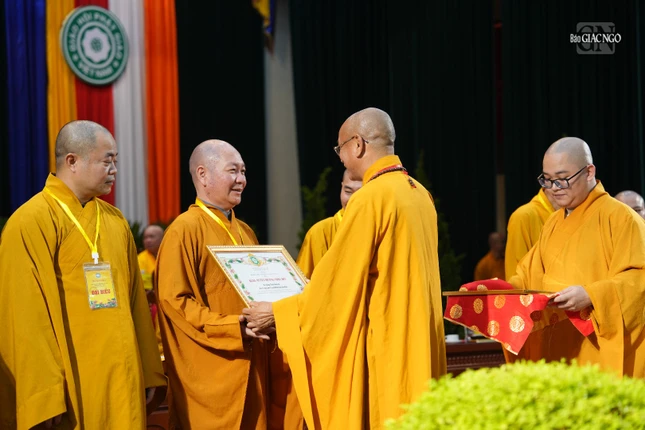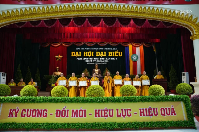 Dịp này, Đại đức Thích Nguyên Chính, Ủy viên Thư ký Hội đồng Trị sự, Phó Chánh Văn phòng I T.Ư công bố quyết định tặng Bằng tuyên dương công đức của Trung ương Giáo hội đến 81 cá nhân; Ủy ban MTTQVN tỉnh Ninh Bình trao tặng Bằng khen đến 1 tập thể và 16 cá nhân tiêu biểu có thành tích xuất sắc trong công tác Phật sự, phụng đạo yêu nước nhiệm kỳ 2022-2027.