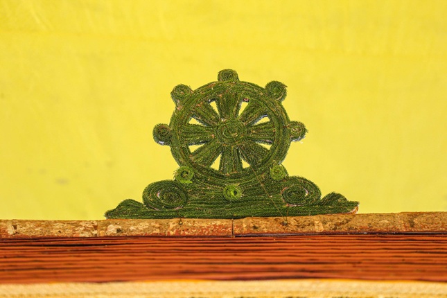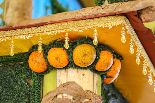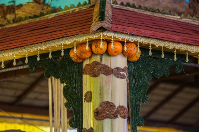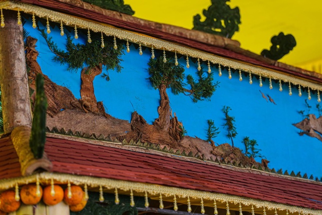 Toàn bộ trang trí trên đình phủ lò hỏa táng được các nghệ nhân Phật tử cố đô Huế trang trí bằng chất liệu cây cỏ tự nhiên rất tinh tế - Ảnh: Lê Hoài Nhân |