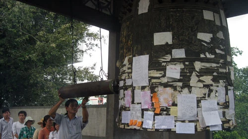 Thế nhưng khi bước vào chỗ đặt chuông, những hình ảnh không đẹp xuất hiện. Chuông bị nhiều người dán giấy cầu an, cầu siêu... lên bề mặt. Qua nhiều ngày, lớp giấy này chưa được bóc đi, lớp giấy khác lại được dán chồng lên trông rất phản cảm.