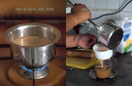 7. Lọc cặn trà và gia vị, đổ nước trà vào một tách khác.