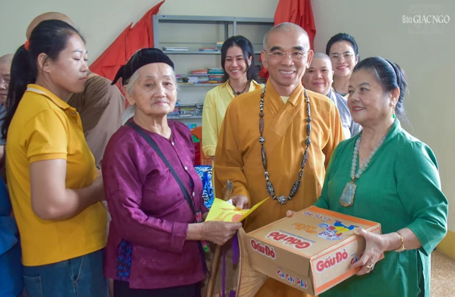 | Đại đức Thích Minh Đạo và Ni trưởng Thích nữ Từ Nhẫn chia sẻ niềm vui cùng cụ bà lớn tuổi |