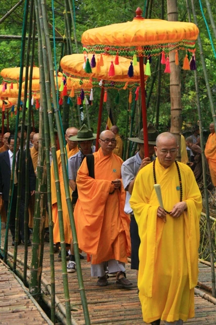Trên khán đài, chư tôn Hòa thượng, chư Thượng tọa, Đại đức Tăng Ni, các vị khách mời an tọa trang nghiêm trong màu huỳnh y thiêng liêng.