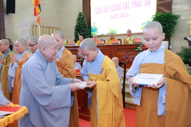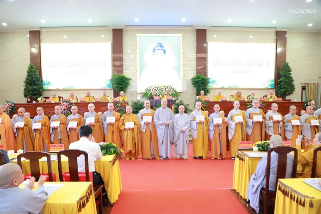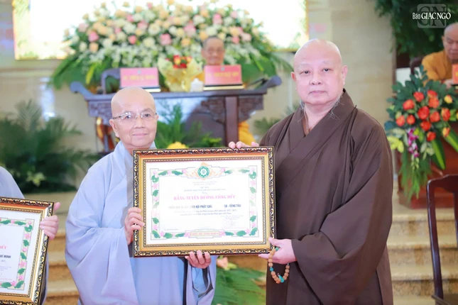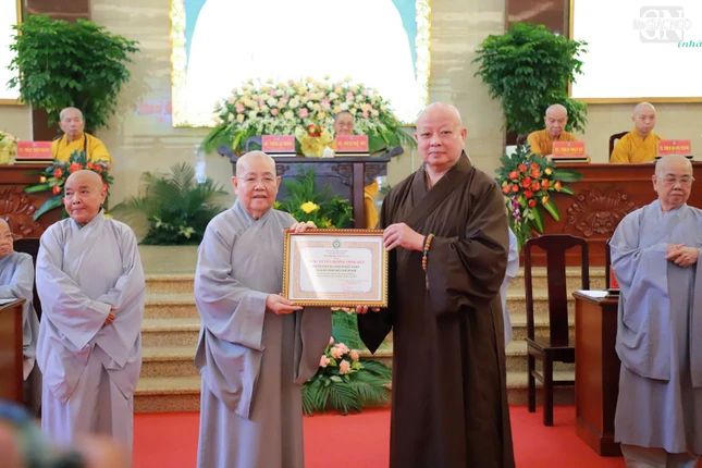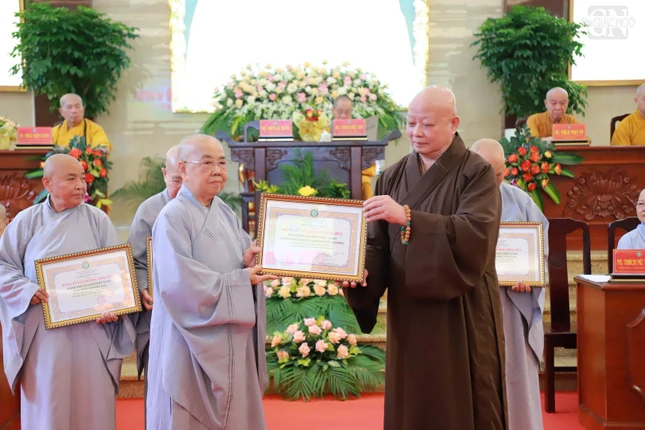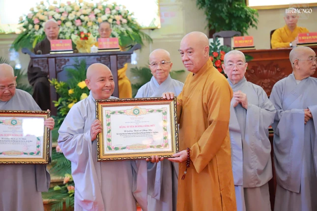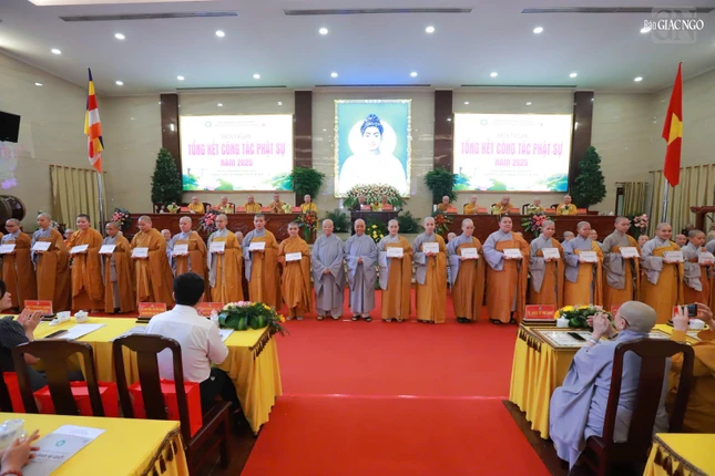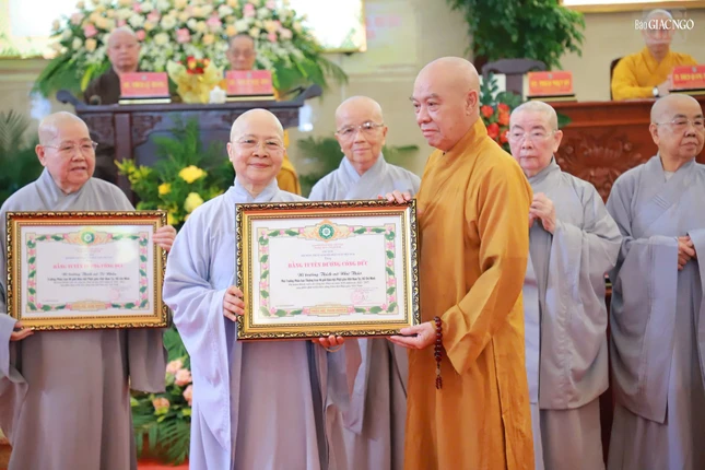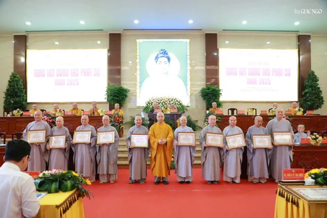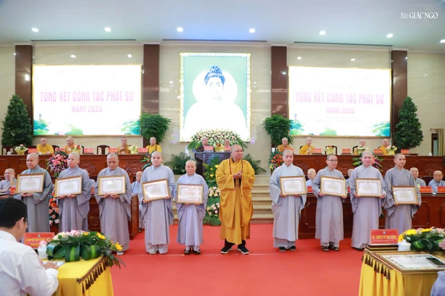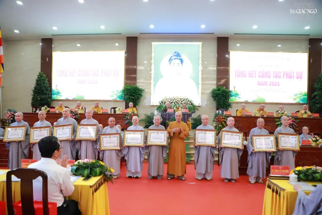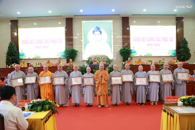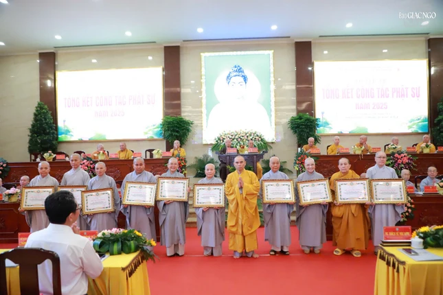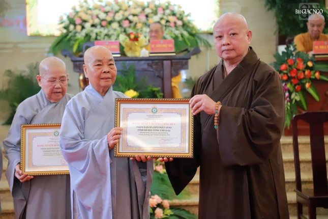 Dịp này, Ban Thường trực Hội đồng Trị sự đã trao Bằng tuyên dương công đức đến 3 tập thể (Phân ban Ni giới TP.HCM cũ, Phân ban Ni giới Bình Dương cũ và Phân ban Ni giới Bà Rịa Vũng Tàu cũ) và 35 cá nhân Phân ban Ni giới TP.HCM đã hoàn thành tốt công tác Phật sự năm 2025. Ban Thường trực Trị sự GHPGVN TP.HCM trao tặng Bằng tuyên dương công đức đến 4 tập thể và 36 cá nhân thuộc Phân ban Ni giới TP.HCM.