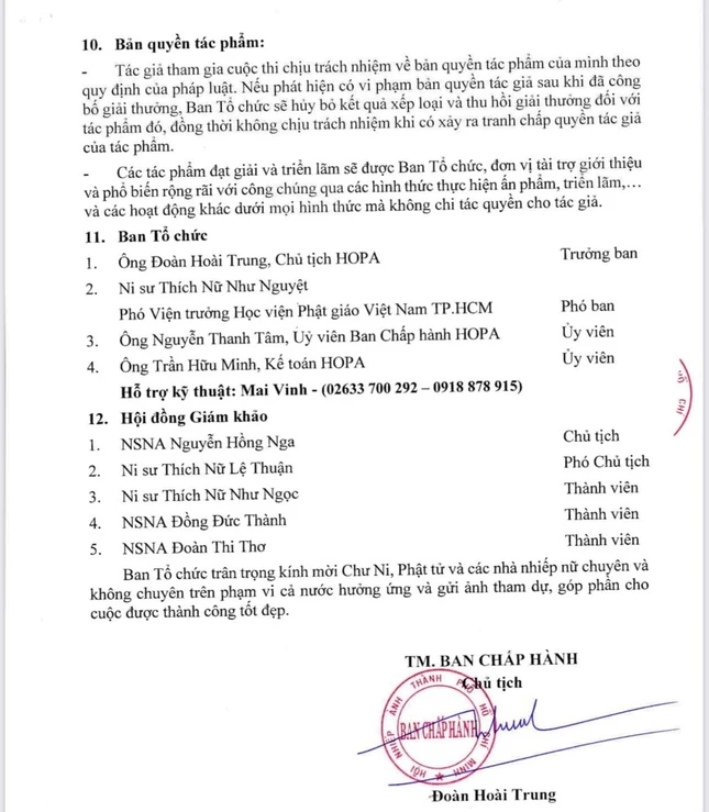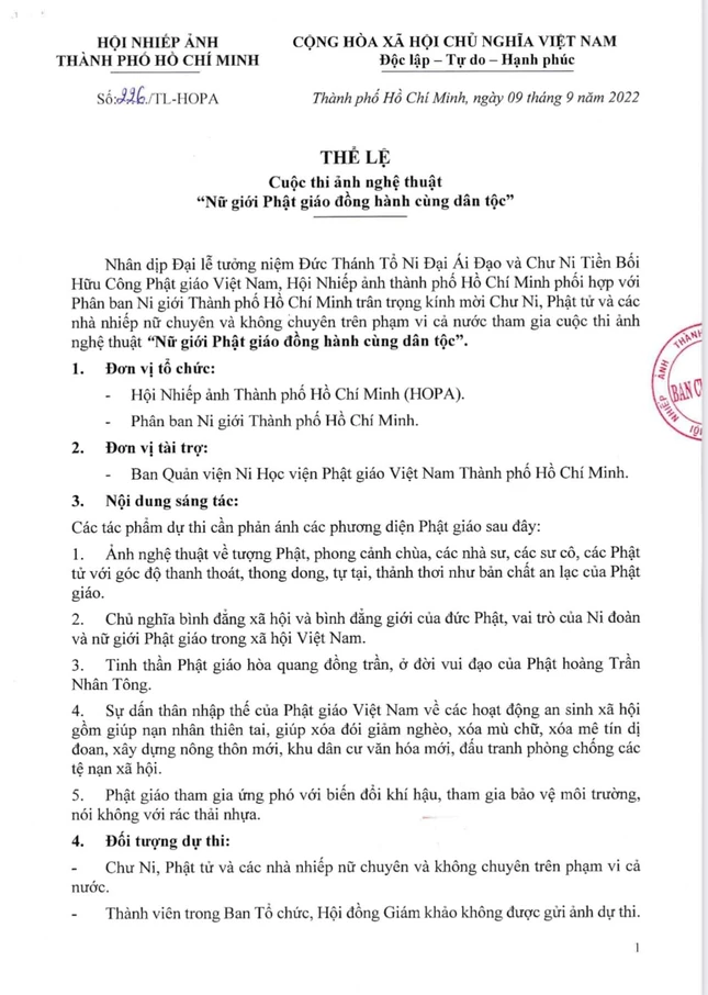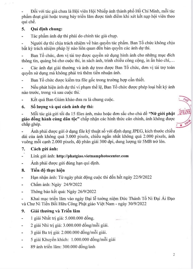 Mỗi tác giả gửi tối đa 15 files ảnh, màu hoặc đơn sắc cho chủ đề “Nữ giới Phật giáo đồng hành cùng dân tộc”, chấp nhận các hình thức cân chỉnh, ảnh không được chắp ghép.