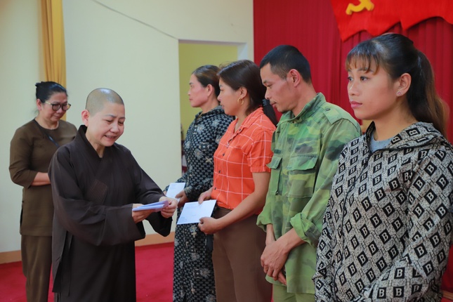 Ni trưởng Thích nữ Như Như trao quà đến hộ bị ảnh hưởng nặng nề do bão lũ |