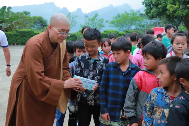 Ni trưởng Thích nữ Nhật Khương thay mặt đoàn động viên, khích lệ tinh thần các thầy cô giáo, Ban Giám hiệu và các em học sinh Trường Phổ thông Dân tộc Bán trú Tiểu học Nậm Mòn 1 luôn chân cứng đá mềm vượt qua khó khăn. Theo Ni trưởng, thầy cô giáo là người thay cho cha mẹ các học sinh dạy chữ, lễ nghĩa để làm người, cho tương lai các em được tươi sáng.