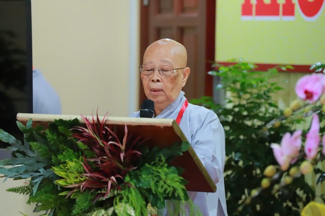 Ni sư Thích nữ Huệ Đức báo cáo về quá trình chuẩn bị và công tác tổ chức Khóa bồi dưỡng kỹ năng và Hội thi dẫn chương trình Phật giáo |
