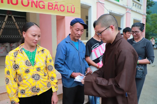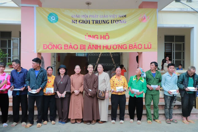 Ni trưởng Thích nữ Nhật Khương trao quà đến những hộ bị ảnh hưởng bão lũ |