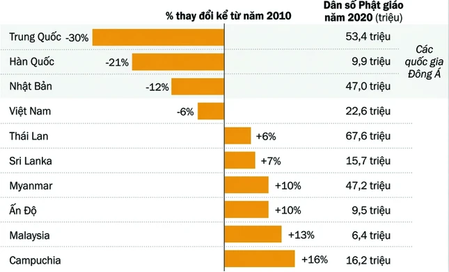 Chẳng hạn, tại Nhật Bản, một khảo sát của Pew Research Center năm 2024 cho thấy 40% người trưởng thành từng được nuôi dạy trong gia đình Phật giáo hiện không còn gắn bó với tôn giáo này. Ở Hàn Quốc, tỷ lệ này cao hơn, lên tới 42%.