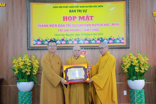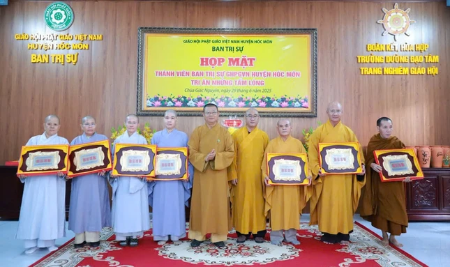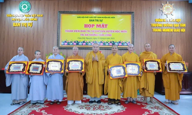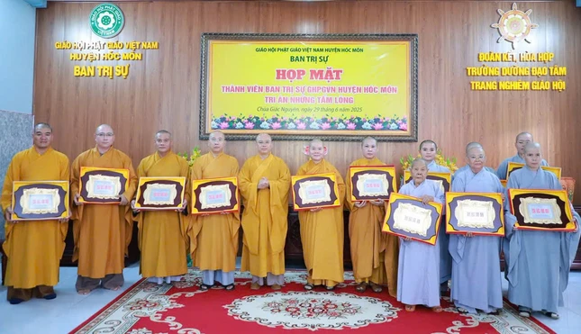 Dịp này, Ban Trị sự GHPGVN H.Hóc Môn tặng Kỷ niệm chương tri ân đến chư tôn đức chứng minh, thành viên Ban Trị sự đã đồng hành, hỗ trợ trong thời gian qua.