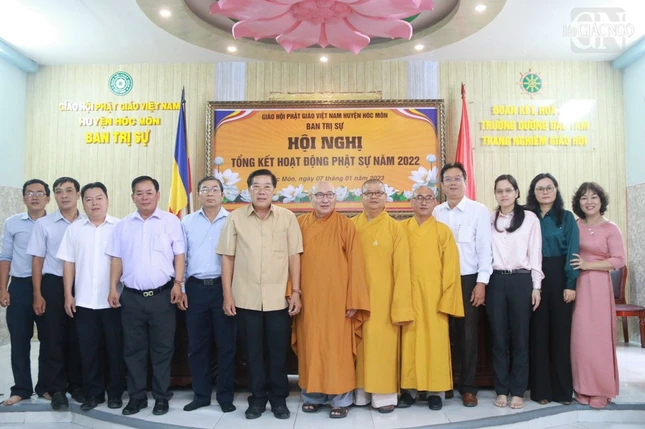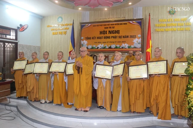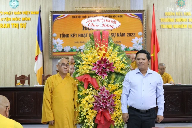 Dịp này, Ban Trị sự GHPGVN huyện đã tặng khánh vàng chúc mừng chư tôn đức được tấn phong giáo phẩm tại Đại hội Phật giáo toàn quốc lần IX tại thủ đô Hà Nội. Nhiều lẵng hoa đã được gởi đến và trao tặng trong hội nghị tổng kết Phật sự của Phật giáo huyện Hóc Môn.