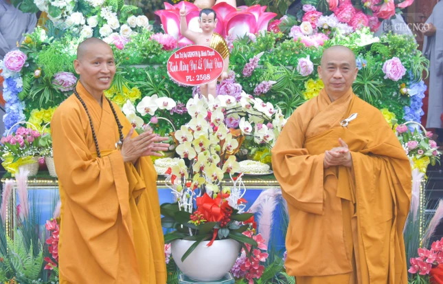 | Thượng tọa Thích Minh Quang nhận lẵng hoa chúc mừng của Ban Thường trực Ban Trị sự GHPGVN do Thượng tọa Thích Trung Nguyện trao tặng |