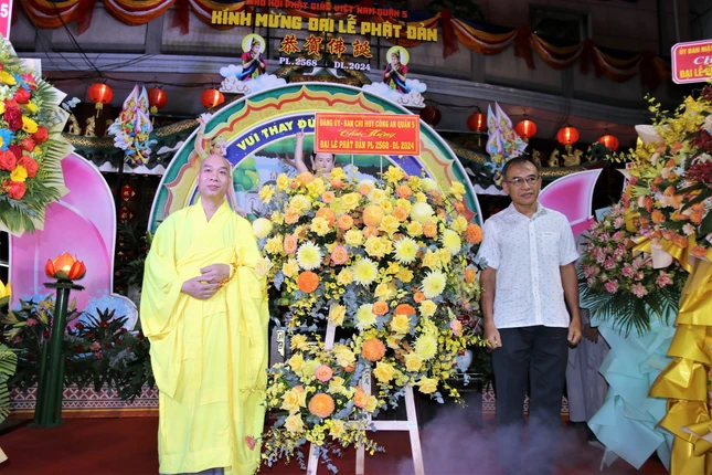 Buổi lễ đón nhận nhiều lẵng hoa tươi thắm từ các cấp chính quyền chúc mừng mùa Phật đản nhiều hỷ lạc đến toàn thể Tăng Ni, Phật tử.
