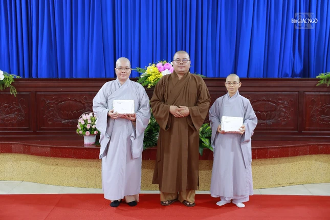Thượng tọa Thích Tâm Chơn trao giải nhất đến Sư cô Thích nữ Định Tâm Hương với đề tài thi Tứ chánh cần |
