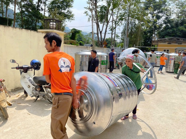 | Đoàn đã trao 190 bồn chứa nước 1.000 lít cùng các đồ dùng gia dụng thiết yếu và tiền mặt... nhằm giúp bà con vùng bão lũ tái thiết đời sống sau thiên tai |