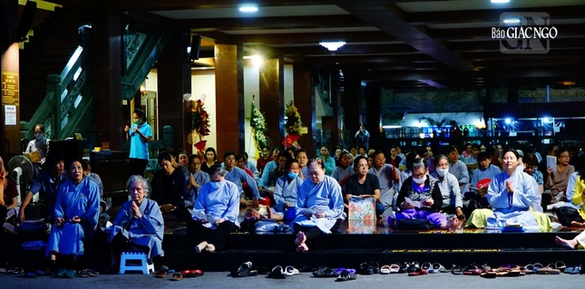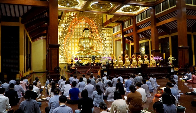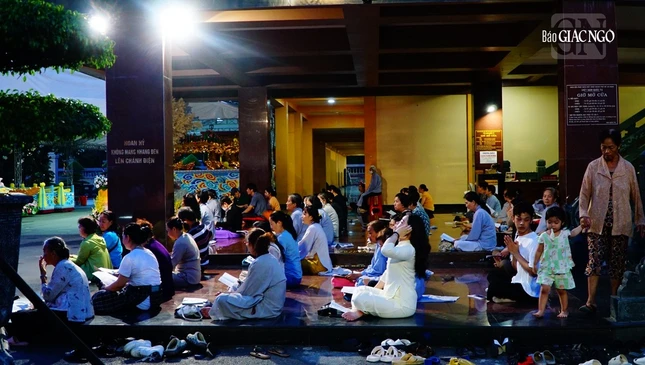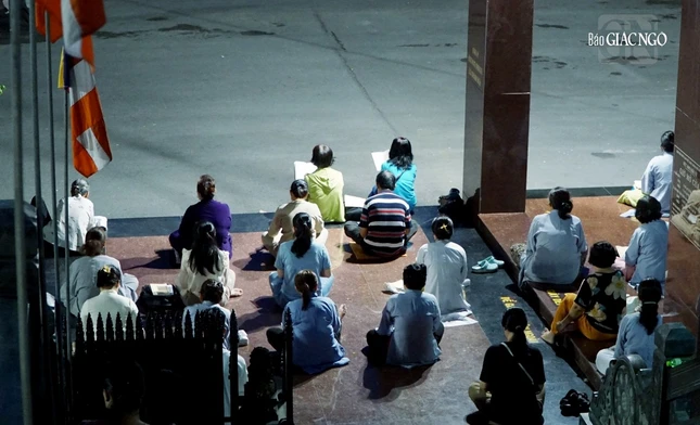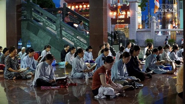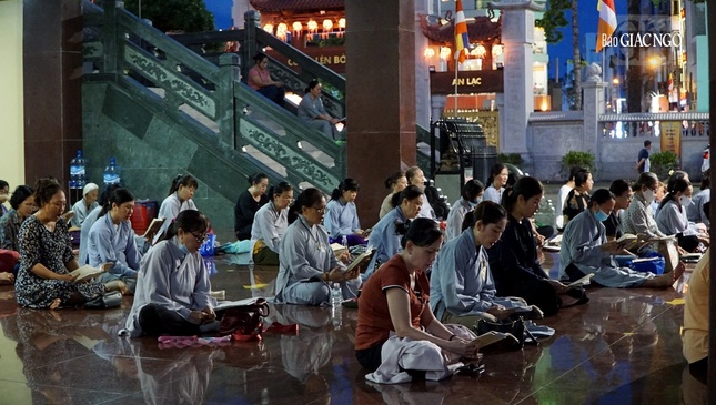 Tại chánh điện Việt Nam Quốc Tự, Phật tử trang nghiêm tham gia thời khóa tối, cùng với đó tại sảnh trước Việt Nam Quốc Tự, Phật tử tùy duyên hướng về tôn tượng Đức Quán Thế Âm cùng nhau nhất tâm trì tụng trong khóa lễ.