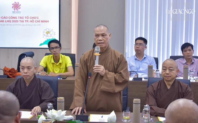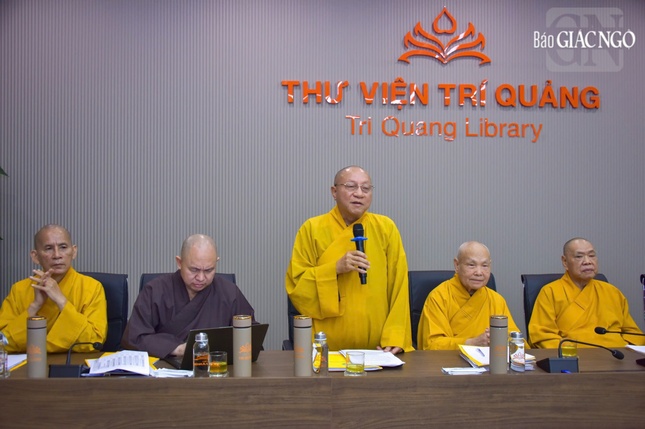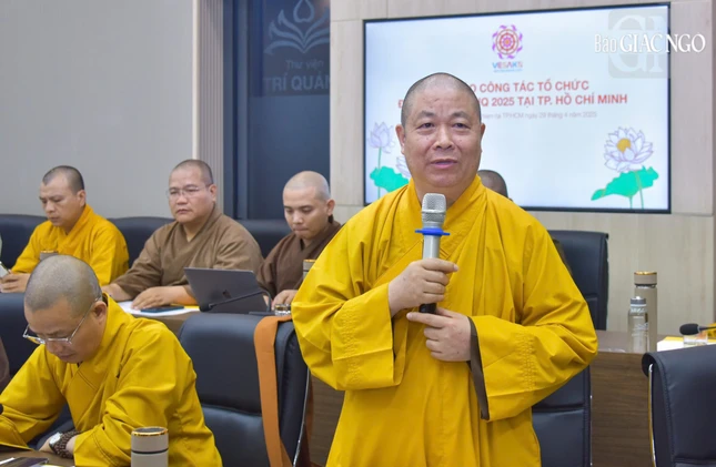 Phát biểu mở đầu phiên họp, Trưởng lão Hòa thượng Thích Thiện Nhơn đã nêu khái quát lại tiến trình tổ chức thực hiện Đại lễ Vesak Liên Hiệp Quốc 2025 tại TP.HCM. Trong đó có các phiên họp giữa GHPGVN và ICDV để thống nhất các nội dung cơ bản của Đại lễ; các cuộc họp giữa lãnh đạo Chính phủ, các Bộ, Ban ngành và chính quyền TP.HCM và các tỉnh với Hội đồng Trị sự cũng như các cuộc họp liên ngành để xúc tiến các công việc liên quan, công tác kiểm tra tiến độ các khâu chuẩn bị, tổ chức Đại lễ Vesak.