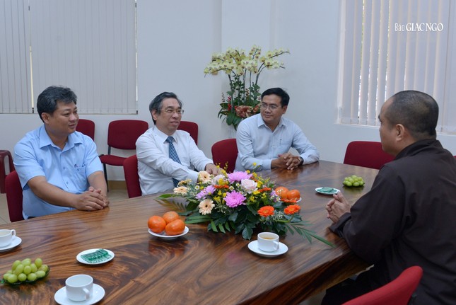 Thượng tọa Thích Tâm Hải, Tổng Biên tập và chư Hòa thượng Ban Từ thiện xã hội Báo Giác Ngộ trân trọng tiếp phái đoàn.