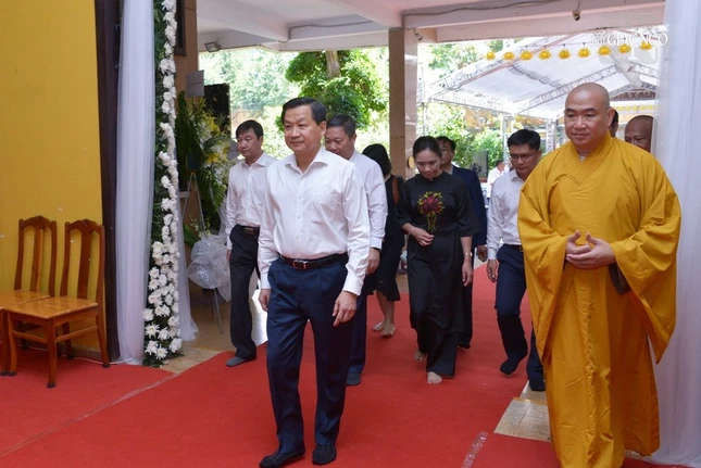 Trước Giác linh đường, Phó Thủ tướng Lê Minh Khái cùng phái đoàn thành kính dâng hương, dành phút mặc niệm tưởng niệm, tri ân những đóng góp của Trưởng lão Hòa thượng Thích Hiển Tu cho Dân tộc.