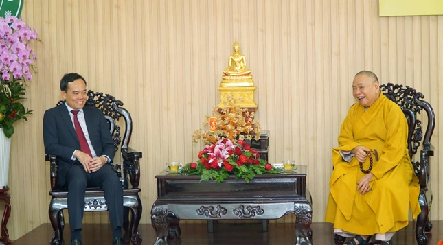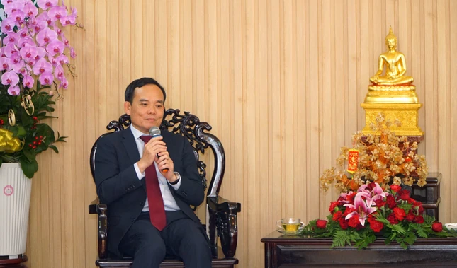 Sau khi thăm hỏi sức khỏe Đức Pháp chủ - Đại lão Hòa thượng Thích Trí Quảng, Phó Thủ tướng Chính phủ Trần Lưu Quang thay mặt đoàn thông tin về tình hình của đất nước, trong đó có những khó khăn do ảnh hưởng vấn nạn chiến tranh trên thế giới, nhất là tác động của hiện tượng biến đổi khí hậu toàn cầu khắc nghiệt và khó lường. Ông Trần Lưu Quang cũng chia sẻ dự báo về sự phát triển của đất nước năm 2025, trong đó vẫn còn nhiều khó khăn phải đối mặt và nỗ lực để vượt qua.