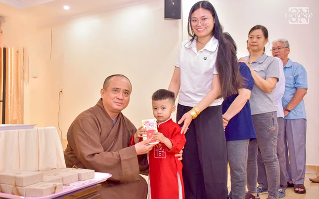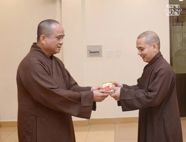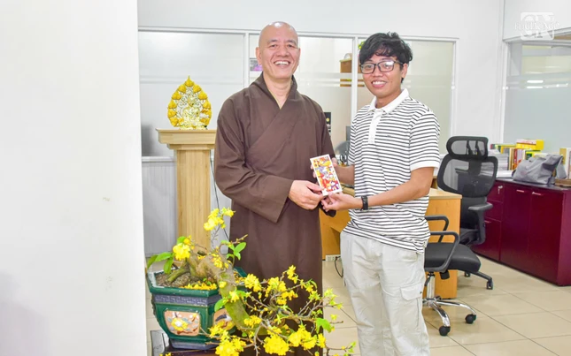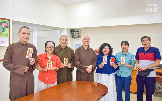 Dịp này, Hòa thượng Cố vấn và Thượng tọa Tổng Biên tập đã trao lộc đầu xuân đến chư tôn đức Tăng Ni, cán bộ, phóng viên và nhân viên Báo Giác Ngộ trong niềm hoan hỷ chung của những ngày đầu năm mới.