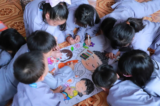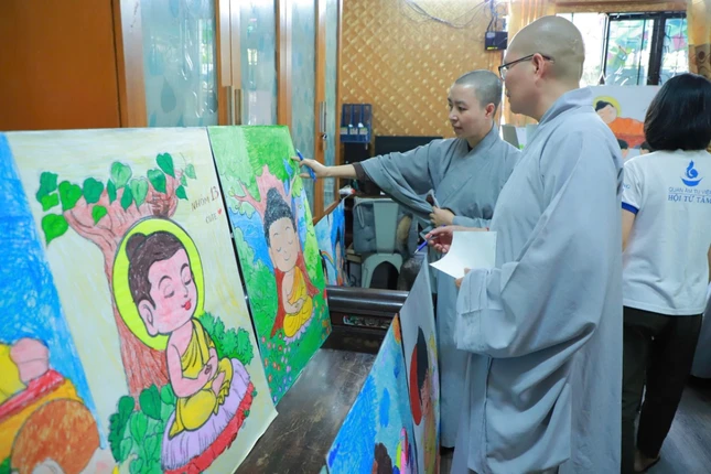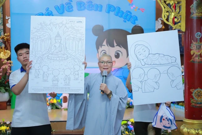 Chiều cùng ngày, các em tham gia hoạt động tô màu, vẽ tranh về cuộc đời Đức Phật. Mỗi bức tranh là một thế giới sáng tạo, phản chiếu cảm nhận riêng của các em: có em tô da Phật màu vàng, có em chọn màu đen, tất cả đều mang hình ảnh “Đức Phật trong em” thật hồn nhiên, chân thành và đáng yêu.