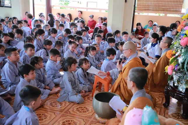 Tại chánh điện, dưới sự hướng dẫn của Ni sư Thích nữ Huệ Đức, trụ trì chùa cùng các Sư cô, các bé nghiêm trang chắp tay lễ Phật, đồng thanh trì tụng câu thần chú của Đức Bồ-tát Quán Thế Âm “Om Mani Padme Hum” và chú của Đức Văn Thù “Om Ah Ra Ba Sa Na Dhi”.