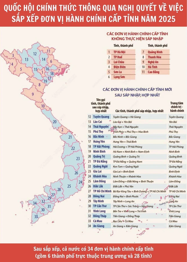 Theo đề án sắp xếp đơn vị hành chính của Chính phủ trình Quốc hội, 63 tỉnh, thành phố giảm xuống còn 34 đơn vị, trong đó có 6 thành phố trực thuộc Trung ương là: Hà Nội, TP.HCM, Hải Phòng, Huế, Đà Nẵng, Cần Thơ và 28 tỉnh.