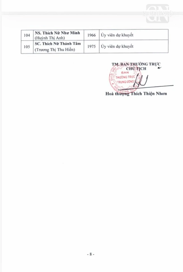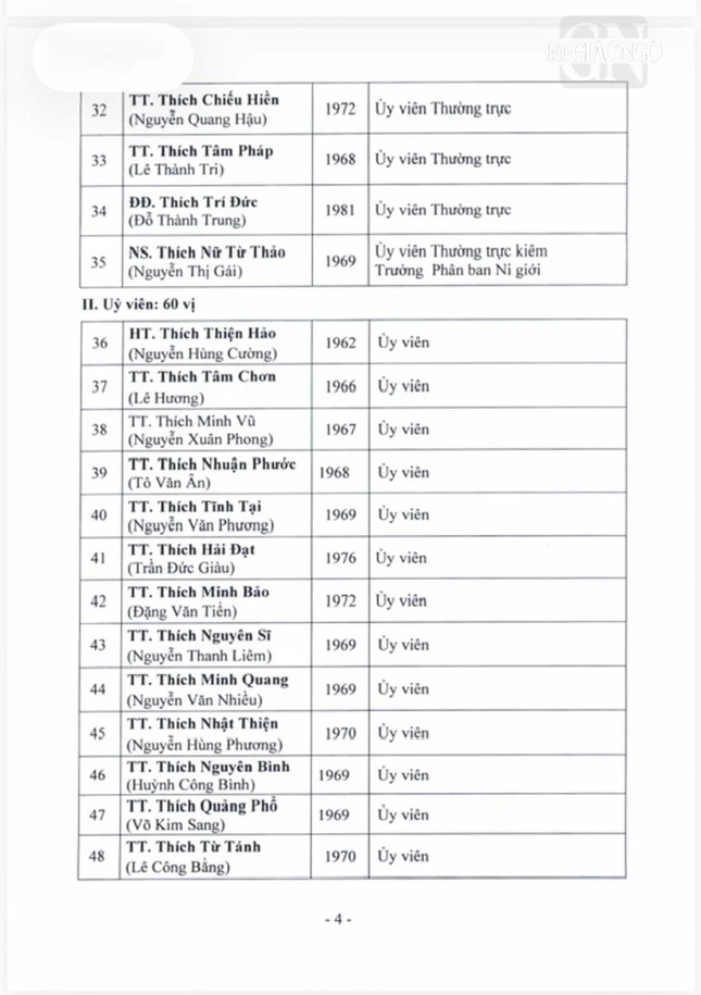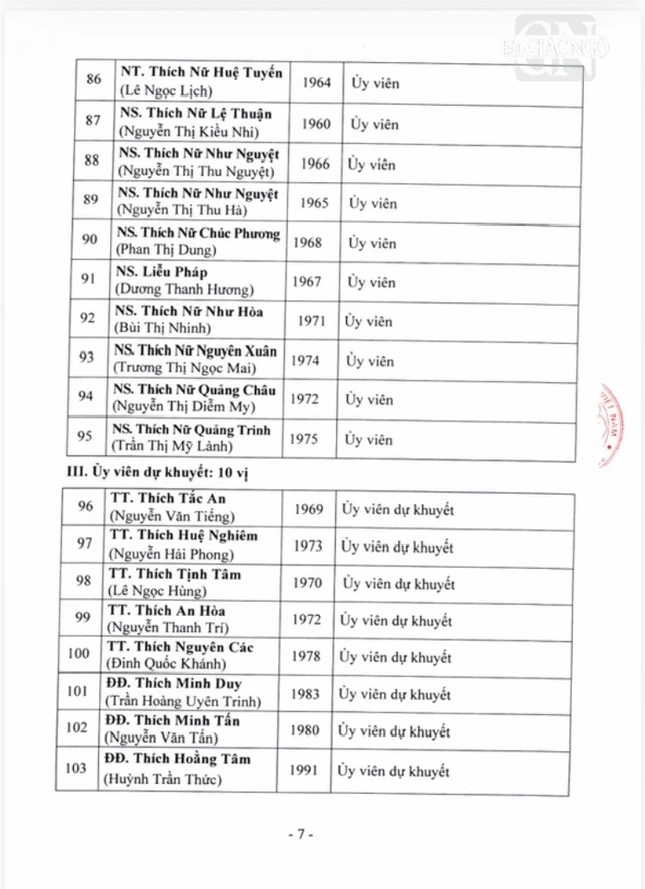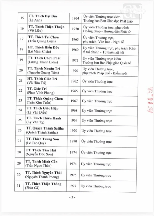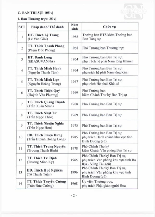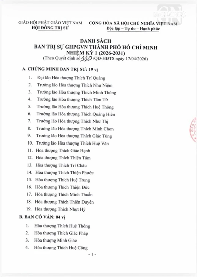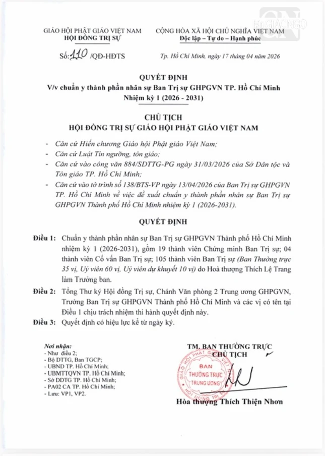 GNO - Trưởng lão Hòa thượng Thích Thiện Nhơn, Phó Pháp chủ Hội đồng Chứng minh, Chủ tịch Hội đồng Trị sự GHPGVN đã ấn ký Quyết định số 110/QĐ-HĐTS của Hội đồng Trị sự, ngày 17-4-2026 về việc chuẩn y thành phần nhân sự Ban Trị sự GHPGVN TP.HCM nhiệm kỳ I (2026-2031).
