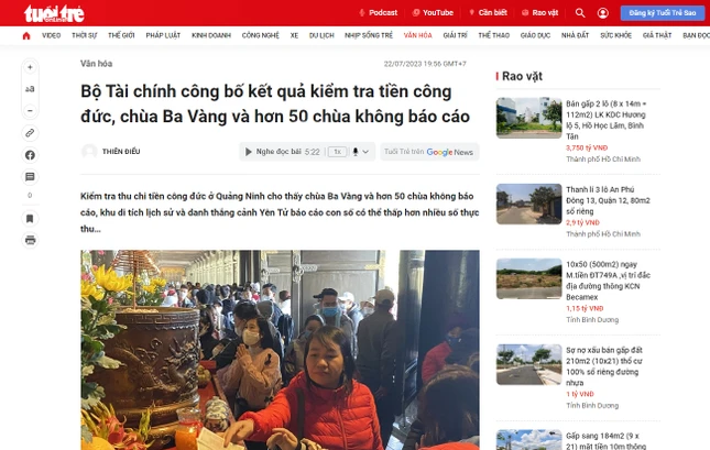 Nhiều báo, trong đó có báo Tuổi Trẻ, Công Thương - Cơ quan ngôn luận của Bộ Công thương đã đặt tít sai, biến hơn 50 di tích là các đền, đình, cơ sở cách mạng trong báo cáo của Bộ Tài chính thành "chùa", gây bức xúc trong dư luận - Ảnh chụp màn hình sáng 23-7-2023 |
