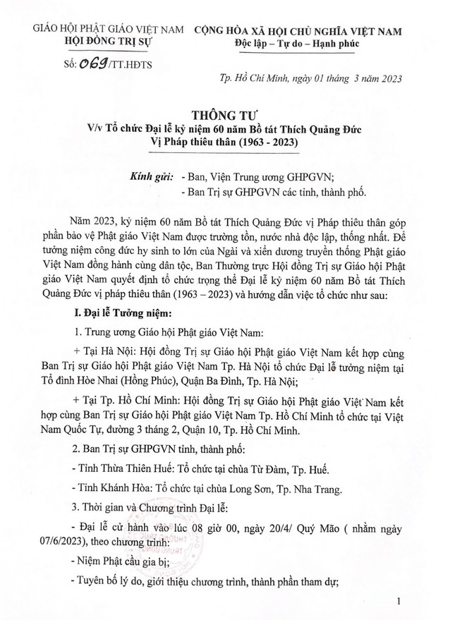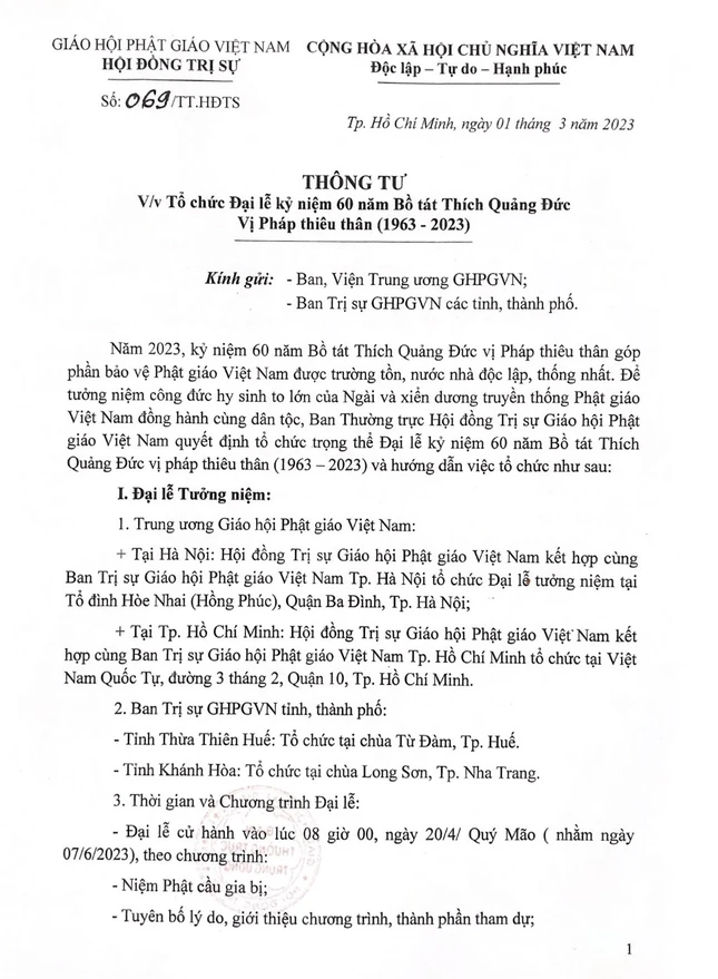 Thông tư nhận định Bồ-tát Thích Quảng Đức vị pháp thiêu thân “góp phần bảo vệ Phật giáo Việt Nam được trường tồn, nước nhà độc lập, thống nhất”. Do vậy, để tưởng nhớ đức hy sinh của ngài, Ban Thường trực Hội đồng Trị sự GHPGVN quyết định trọng thể Đại lễ kỷ niệm 60 năm Bồ-tát Thích Quảng Đức vị pháp thiêu thân (1963-2023), tại 4 địa điểm Hà Nội, TP.HCM, Khánh Hòa và Thừa Thiên Huế.