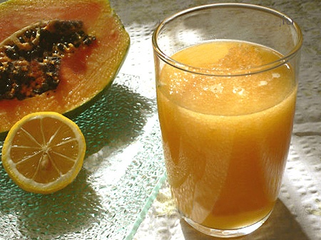 Đu đủ đã thái miếng, 2 – 3 lát chanh cả vỏ, nước cốt chanh, mật ong 2 thìa (độ ngọt tùy khẩu vị của bạn), 1 cốc nước mát, tất cả cho vào máy xay sinh tố. Ấn nút xay khoảng 20 giây. Các nguyên liệu nhuyễn mịn và hòa quyện với nhau, đổ ra cốc. Thêm đá nếu bạn thích uống lạnh.